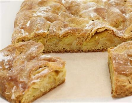 Découpez 2 rectangles dans la pâte : sur l'un, ajoutez quelques quartiers de pommes très fins (je vous recommande des pommes un peu acides) et saupoudrez-les de sucre. Puis recouvrez le tout avec l'autre rectangle de pâte.