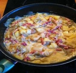 Faire revenir les oignons émincés et les lardons dans une sauteuse. Ajouter endives et pommes de terre.